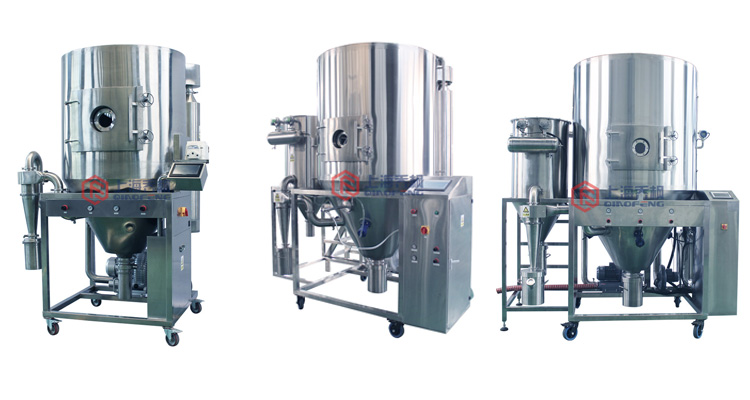 該機(jī)組核心裝置為造粒霧化器。藉此將液體霧化成微米級(jí)霧滴后被熱風(fēng)迅速干燥,干燥后的顆粒經(jīng)過(guò)底部收料瓶回收,粉末經(jīng)過(guò)旋風(fēng)分離器回收。設(shè)計(jì)進(jìn)風(fēng)溫度最高為250℃,出風(fēng)溫度為145℃左右。